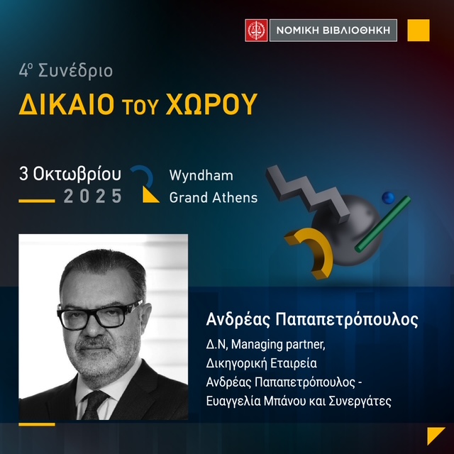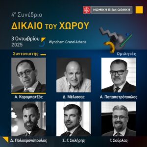 Η Νομική Βιβλιοθήκη μαζί με το Επιστημονικό Περιοδικό “Περιβάλλον και Δίκαιο” διοργανώνουν το 4ο Συνέδριο ”Δίκαιο του Χώρου” την Παρασκευή 3 Οκτωβρίου. Αντικείμενο του Συνεδρίου αποτελεί το ακίνητο και η νομική του μεταχείριση ως αντικείμενο αξιοποίησης και επένδυσης, μεταξύ της ιδιωτικής πρωτοβουλίας και της δημόσιας δράσης.
